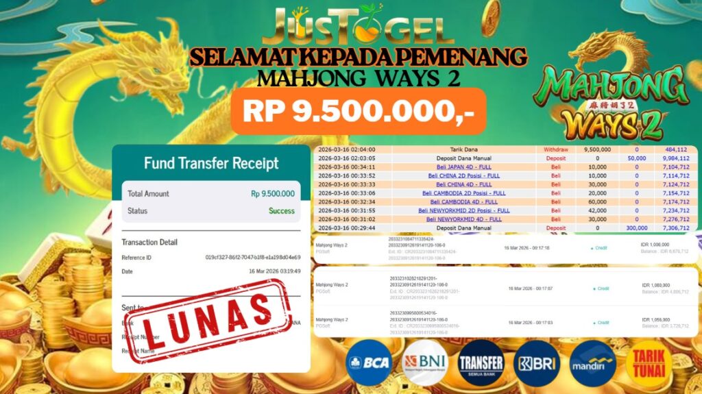 Selamat kepada User ID : PTR***SYHIT Telah berhasil mendapatkan kemenangan besar pada Permainan JP SLOT MAHJONG WAYS 2 Dengan kemenangan Sebesar Rp. 9.500.000,- Setelah mengisi formulir withdraw dengan kurung waktu hanya 5-10 menit pihak JUSTOGEL sudah melakukan transfer kepada pemilik User ID dan dana sudah dapat di cairkan oleh pemenang. Bukti pembayaran yang kami berikan merupakan bukti pembayaran yang SAH / VALID yang langung di dapatkan melaui tanda transfer transaksi dari Bank yang di tuju.