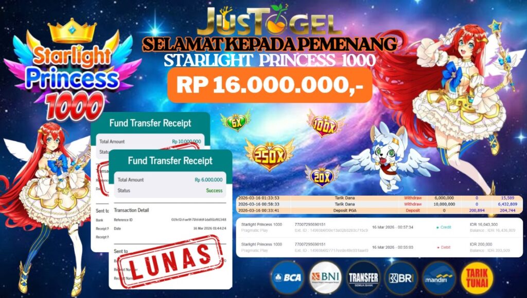Selamat kepada User ID : AGS***NABLHJ Telah berhasil mendapatkan kemenangan besar pada Permainan JP SLOT STARLIGHT PRINCESS 1000 Dengan kemenangan Sebesar Rp. 16.000.000,- Setelah mengisi formulir withdraw dengan kurung waktu hanya 5-10 menit pihak JUSTOGEL sudah melakukan transfer kepada pemilik User ID dan dana sudah dapat di cairkan oleh pemenang. Bukti pembayaran yang kami berikan merupakan bukti pembayaran yang SAH / VALID yang langung di dapatkan melaui tanda transfer transaksi dari Bank yang di tuju.