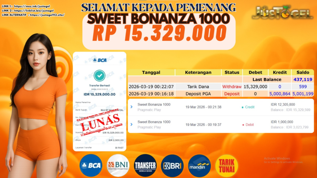 Selamat kepada User ID : GAD***ATU55 Telah berhasil mendapatkan kemenangan besar pada Permainan JP SLOT SWEET BONANZA 1000 Dengan kemenangan Sebesar Rp. 15.329.000,- Setelah mengisi formulir withdraw dengan kurung waktu hanya 5-10 menit pihak JUSTOGEL sudah melakukan transfer kepada pemilik User ID dan dana sudah dapat di cairkan oleh pemenang. Bukti pembayaran yang kami berikan merupakan bukti pembayaran yang SAH / VALID yang langung di dapatkan melaui tanda transfer transaksi dari Bank yang di tuju.