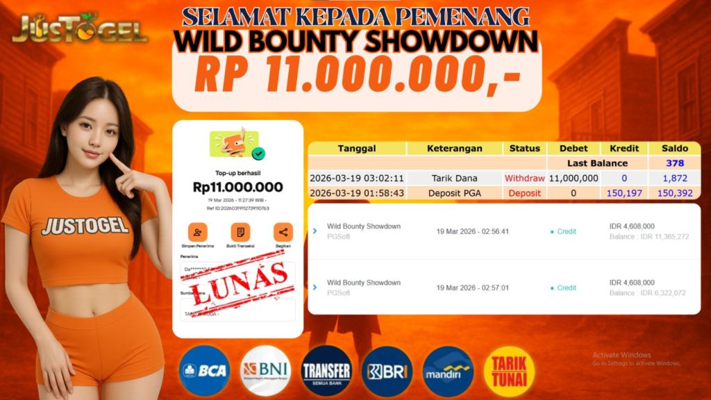Selamat kepada User ID : SUL***SUKA00 Telah berhasil mendapatkan kemenangan besar pada Permainan JP SLOT WILD BOUNTY SHOWDOWN Dengan kemenangan Sebesar Rp. 11.000.000,- Setelah mengisi formulir withdraw dengan kurung waktu hanya 5-10 menit pihak JUSTOGEL sudah melakukan transfer kepada pemilik User ID dan dana sudah dapat di cairkan oleh pemenang. Bukti pembayaran yang kami berikan merupakan bukti pembayaran yang SAH / VALID yang langung di dapatkan melaui tanda transfer transaksi dari Bank yang di tuju.
