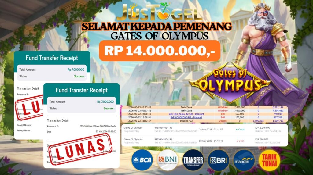 Selamat kepada User ID : DON***CHNRG Telah berhasil mendapatkan kemenangan besar pada Permainan JP SLOT GATES OF OLYMPUS Dengan kemenangan Sebesar Rp. 14.000.000,- Setelah mengisi formulir withdraw dengan kurung waktu hanya 5-10 menit pihak JUSTOGEL sudah melakukan transfer kepada pemilik User ID dan dana sudah dapat di cairkan oleh pemenang. Bukti pembayaran yang kami berikan merupakan bukti pembayaran yang SAH / VALID yang langung di dapatkan melaui tanda transfer transaksi dari Bank yang di tuju.
