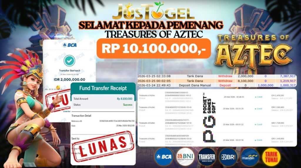 Selamat kepada User ID : DOR***SORBY Telah berhasil mendapatkan kemenangan besar pada Permainan JP SLOT TREASURES OF AZTEC Dengan kemenangan Sebesar Rp. 10.100.000,- Setelah mengisi formulir withdraw dengan kurung waktu hanya 5-10 menit pihak JUSTOGEL sudah melakukan transfer kepada pemilik User ID dan dana sudah dapat di cairkan oleh pemenang. Bukti pembayaran yang kami berikan merupakan bukti pembayaran yang SAH / VALID yang langung di dapatkan melaui tanda transfer transaksi dari Bank yang di tuju.