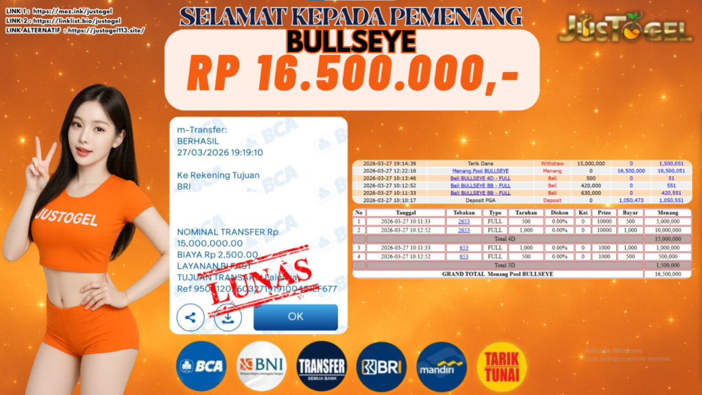 Selamat kepada User ID : AKA***J Telah berhasil mendapatkan kemenangan besar pada Permainan JP TOGEL BULLSEYE Dengan kemenangan Sebesar Rp. 16.500.000,- Setelah mengisi formulir withdraw dengan kurung waktu hanya 5-10 menit pihak JUSTOGEL sudah melakukan transfer kepada pemilik User ID dan dana sudah dapat di cairkan oleh pemenang. Bukti pembayaran yang kami berikan merupakan bukti pembayaran yang SAH / VALID yang langung di dapatkan melaui tanda transfer transaksi dari Bank yang di tuju.