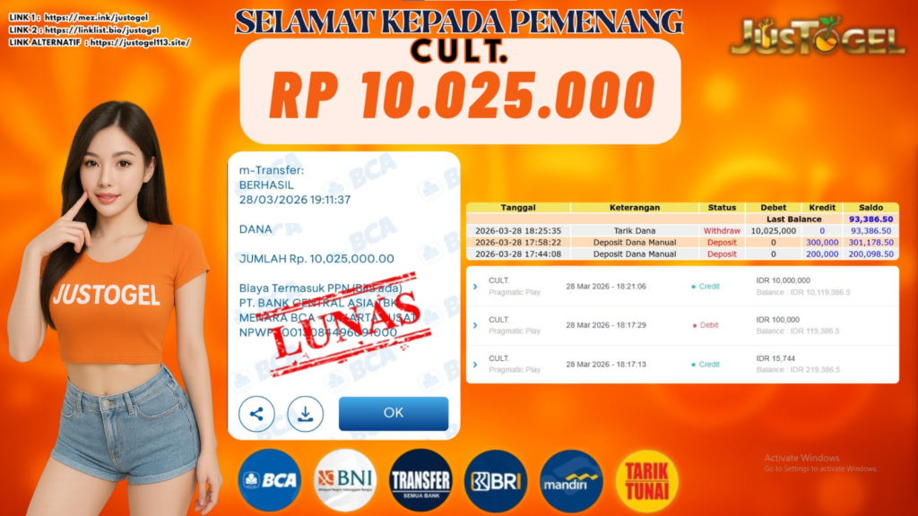 Selamat kepada User ID : MAR***IKUC Telah berhasil mendapatkan kemenangan besar pada Permainan JP SLOT CULT. Dengan kemenangan Sebesar Rp. 10.025.000,- Setelah mengisi formulir withdraw dengan kurung waktu hanya 5-10 menit pihak JUSTOGEL sudah melakukan transfer kepada pemilik User ID dan dana sudah dapat di cairkan oleh pemenang. Bukti pembayaran yang kami berikan merupakan bukti pembayaran yang SAH / VALID yang langung di dapatkan melaui tanda transfer transaksi dari Bank yang di tuju.