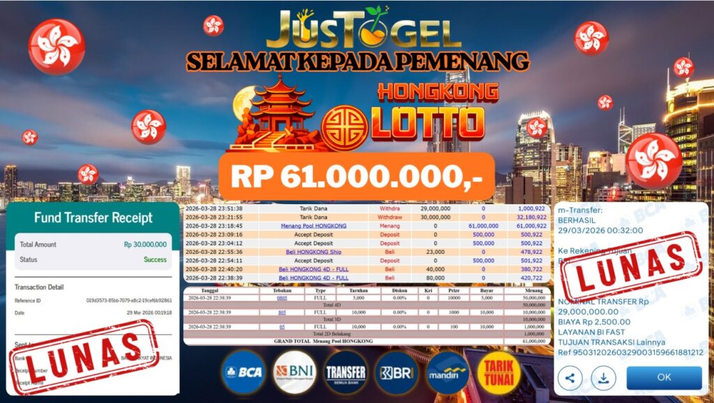 Selamat kepada User ID : DEM***KMP5ANG Telah berhasil mendapatkan kemenangan besar pada Permainan JP TOGEL HONGKONG LOTTO Dengan kemenangan Sebesar Rp. 61.000.000,- Setelah mengisi formulir withdraw dengan kurung waktu hanya 5-10 menit pihak JUSTOGEL sudah melakukan transfer kepada pemilik User ID dan dana sudah dapat di cairkan oleh pemenang. Bukti pembayaran yang kami berikan merupakan bukti pembayaran yang SAH / VALID yang langung di dapatkan melaui tanda transfer transaksi dari Bank yang di tuju.