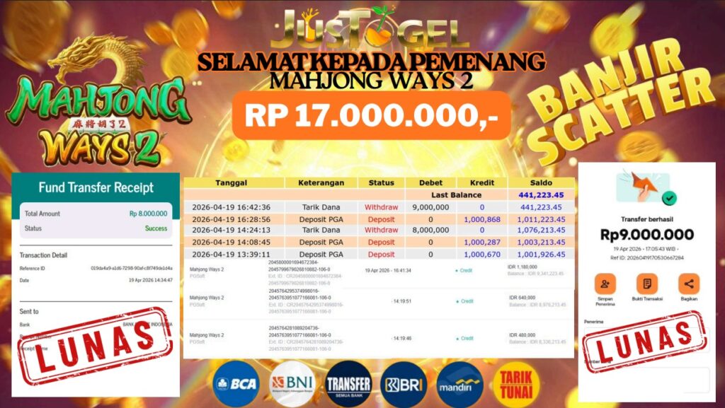 Selamat kepada User ID : SCT***GCCCR Telah berhasil mendapatkan kemenangan besar pada Permainan JP SLOT MAHJONG WAYS 2 Dengan kemenangan Sebesar Rp. 17.000.000,- Setelah mengisi formulir withdraw dengan kurung waktu hanya 5-10 menit pihak JUSTOGEL sudah melakukan transfer kepada pemilik User ID dan dana sudah dapat di cairkan oleh pemenang. Bukti pembayaran yang kami berikan merupakan bukti pembayaran yang SAH / VALID yang langung di dapatkan melaui tanda transfer transaksi dari Bank yang di tuju.