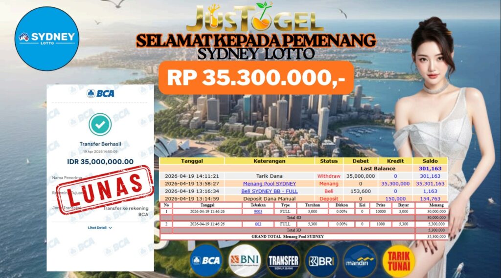 Selamat kepada User ID : BDI***ARDYH berhasil mendapatkan kemenangan besar pada Permainan JP TOGEL SYDNEY LOTTO Dengan kemenangan Sebesar Rp. 35.300.000,- Setelah mengisi formulir withdraw dengan kurung waktu hanya 5-10 menit pihak JUSTOGEL sudah melakukan transfer kepada pemilik User ID dan dana sudah dapat di cairkan oleh pemenang. Bukti pembayaran yang kami berikan merupakan bukti pembayaran yang SAH / VALID yang langung di dapatkan melaui tanda transfer transaksi dari Bank yang di tuju.