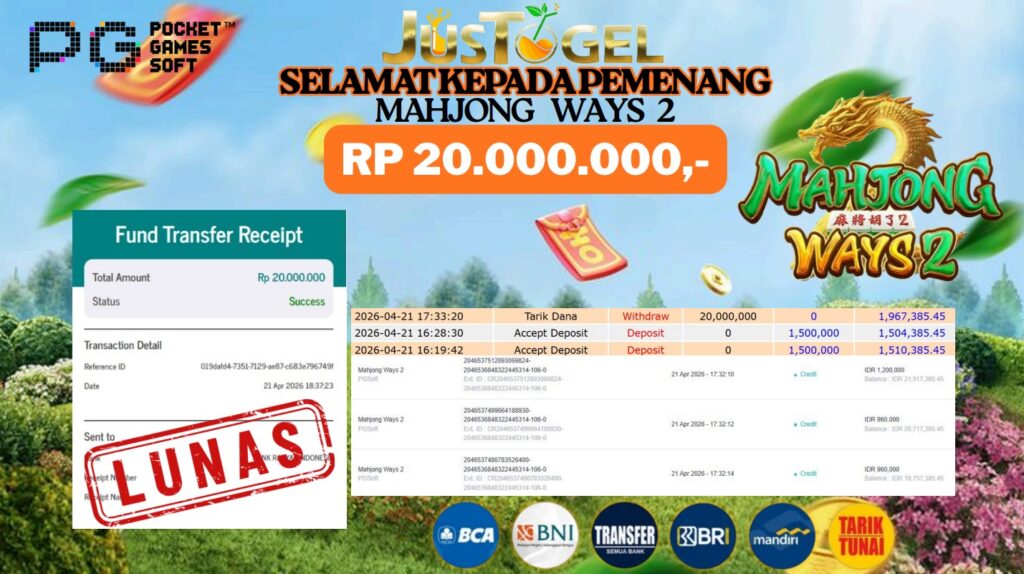 Selamat kepada User ID : BTA***HOXM Telah berhasil mendapatkan kemenangan besar pada Permainan JP SLOT MAHJONG WAYS 2 Dengan kemenangan Sebesar Rp. 20.000.000,- Setelah mengisi formulir withdraw dengan kurung waktu hanya 5-10 menit pihak JUSTOGEL sudah melakukan transfer kepada pemilik User ID dan dana sudah dapat di cairkan oleh pemenang. Bukti pembayaran yang kami berikan merupakan bukti pembayaran yang SAH / VALID yang langung di dapatkan melaui tanda transfer transaksi dari Bank yang di tuju.