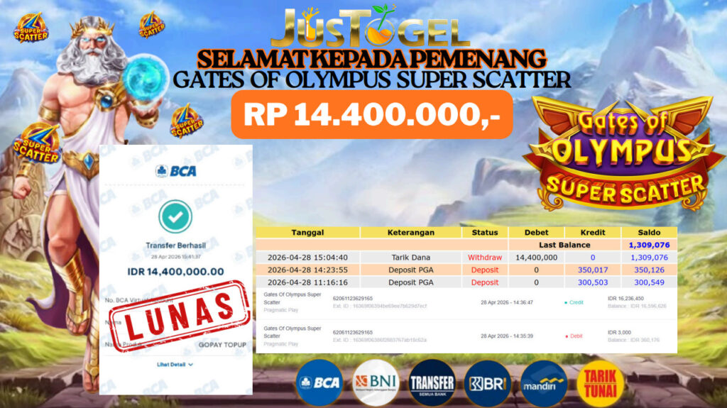 Selamat kepada User ID : AR***MQMTelah berhasil mendapatkan kemenangan besar pada Permainan JP SLOT GATES OF OLYMPUS SUPER SCATTER Dengan kemenangan Sebesar Rp. 14.400.000,- Setelah mengisi formulir withdraw dengan kurung waktu hanya 5-10 menit pihak JUSTOGEL sudah melakukan transfer kepada pemilik User ID dan dana sudah dapat di cairkan oleh pemenang. Bukti pembayaran yang kami berikan merupakan bukti pembayaran yang SAH / VALID yang langung di dapatkan melaui tanda transfer transaksi dari Bank yang di tuju.