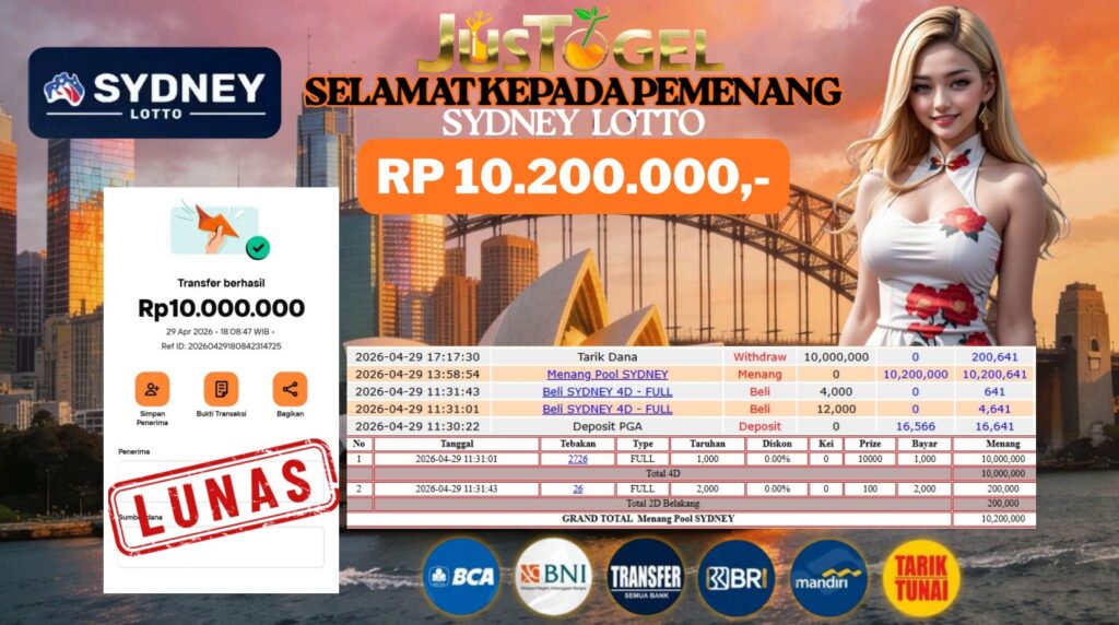 Selamat kepada User ID : AR***MQMTelah berhasil mendapatkan kemenangan besar pada Permainan JP SLOT TOGEL SYDNEY LOTTO Dengan kemenangan Sebesar Rp. 10.200.000,- Setelah mengisi formulir withdraw dengan kurung waktu hanya 5-10 menit pihak JUSTOGEL sudah melakukan transfer kepada pemilik User ID dan dana sudah dapat di cairkan oleh pemenang. Bukti pembayaran yang kami berikan merupakan bukti pembayaran yang SAH / VALID yang langung di dapatkan melaui tanda transfer transaksi dari Bank yang di tuju.