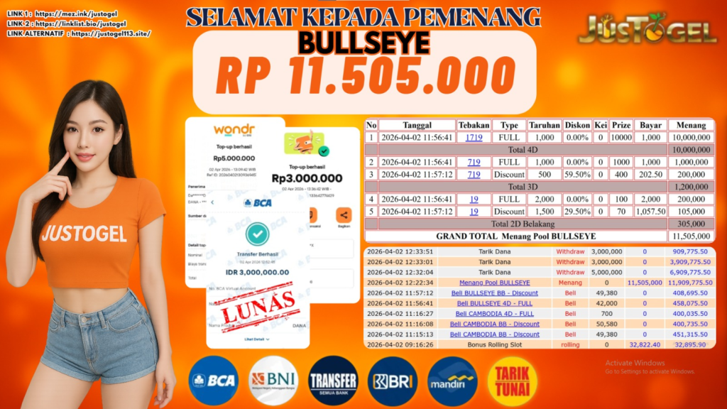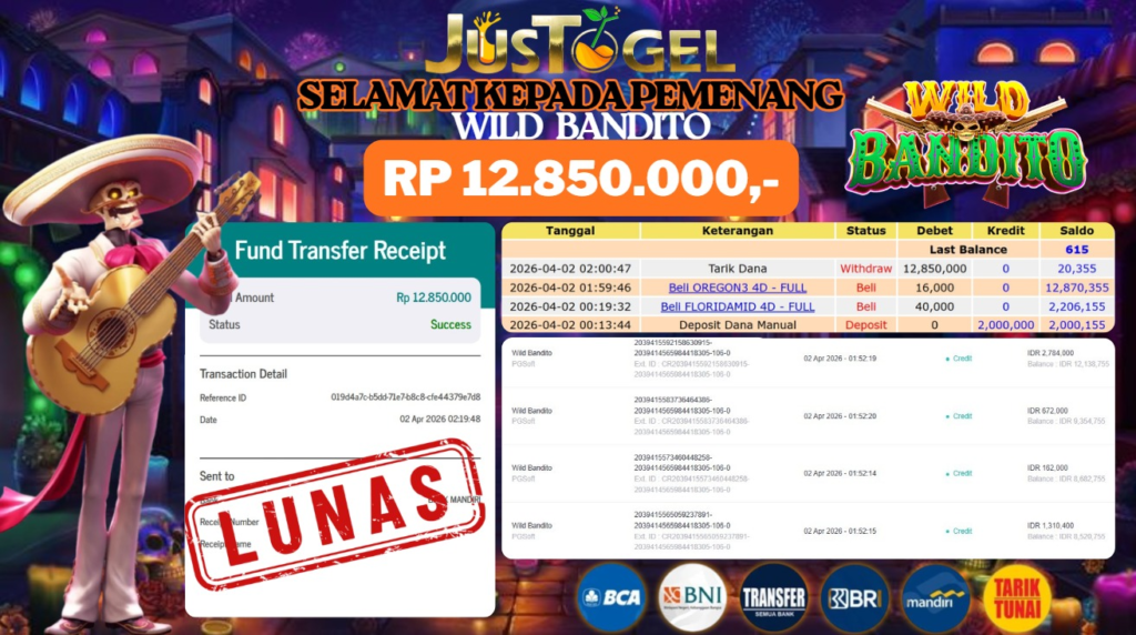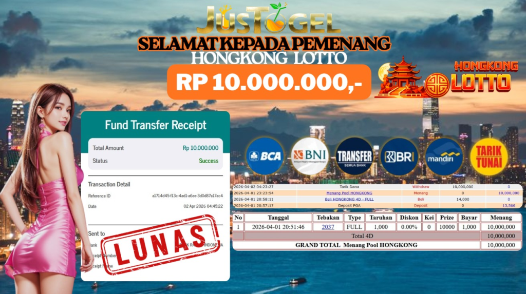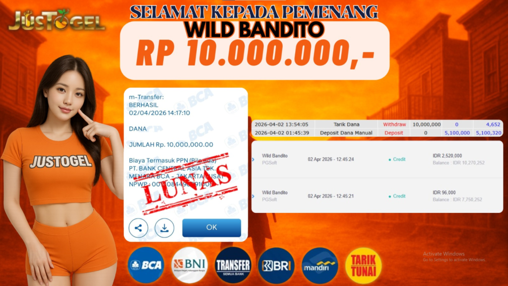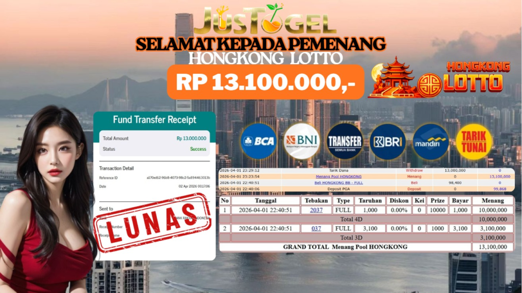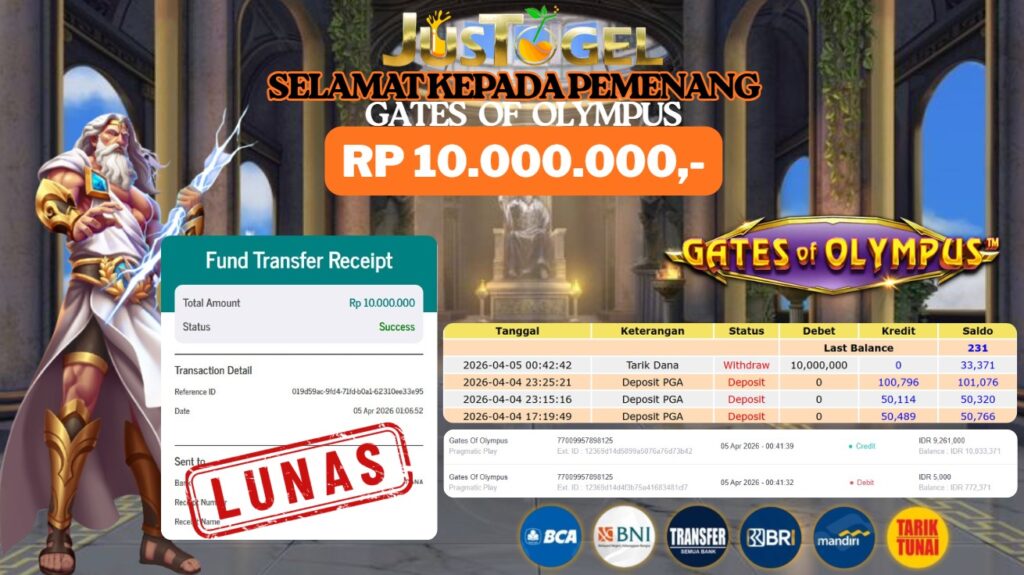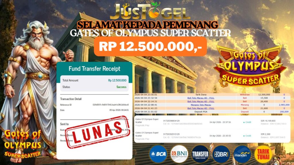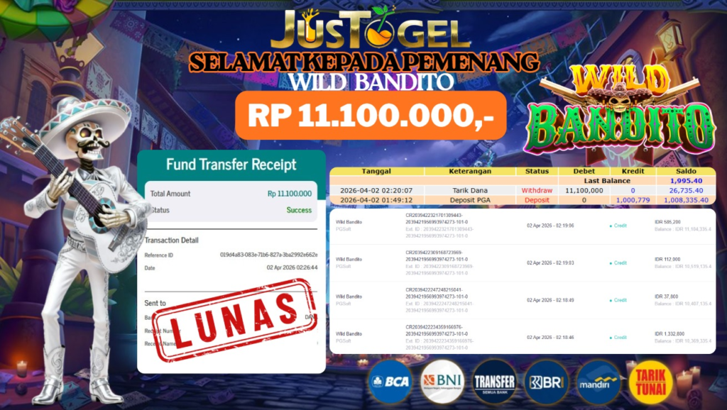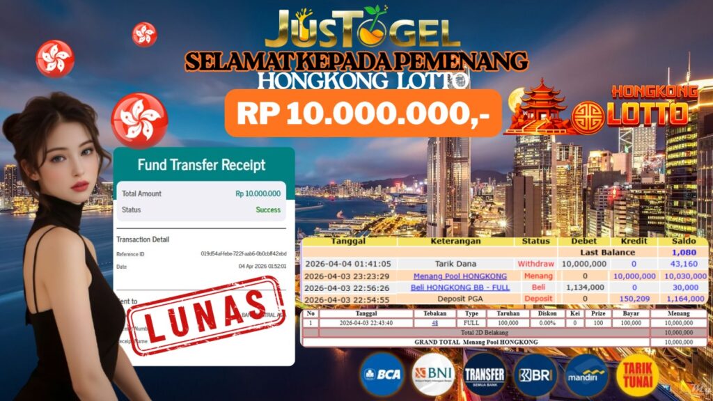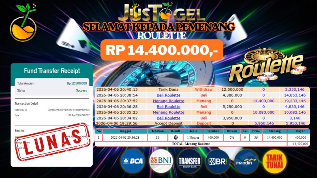 Selamat kepada User ID : AND***SWN52 Telah berhasil mendapatkan kemenangan besar pada Permainan JP LIVE GAME ROULETTE Dengan kemenangan Sebesar Rp. 14.400.000,- Setelah mengisi formulir withdraw dengan kurung waktu hanya 5-10 menit pihak JUSTOGEL sudah melakukan transfer kepada pemilik User ID dan dana sudah dapat di cairkan oleh pemenang. Bukti pembayaran yang kami berikan merupakan bukti pembayaran yang SAH / VALID yang langung di dapatkan melaui tanda transfer transaksi dari Bank yang di tuju.