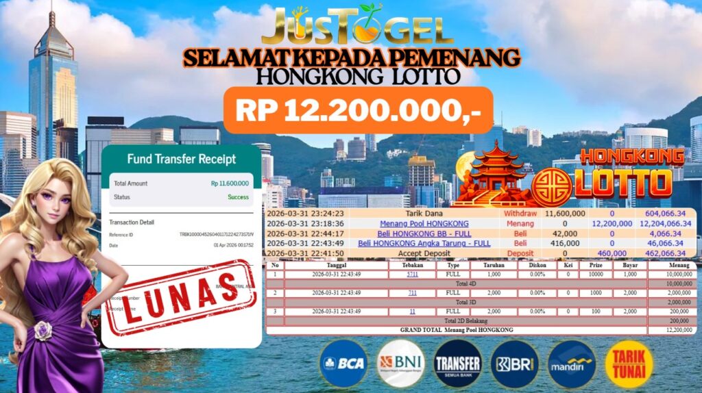 Selamat kepada User ID : AI***YU1000 Telah berhasil mendapatkan kemenangan besar pada Permainan JP TOGEL HONGKONG LOTTO & TOTO MACAU 4D Dengan kemenangan Sebesar Rp. 13.935.000,- Setelah mengisi formulir withdraw dengan kurung waktu hanya 5-10 menit pihak JUSTOGEL sudah melakukan transfer kepada pemilik User ID dan dana sudah dapat di cairkan oleh pemenang. Bukti pembayaran yang kami berikan merupakan bukti pembayaran yang SAH / VALID yang langung di dapatkan melaui tanda transfer transaksi dari Bank yang di tuju.