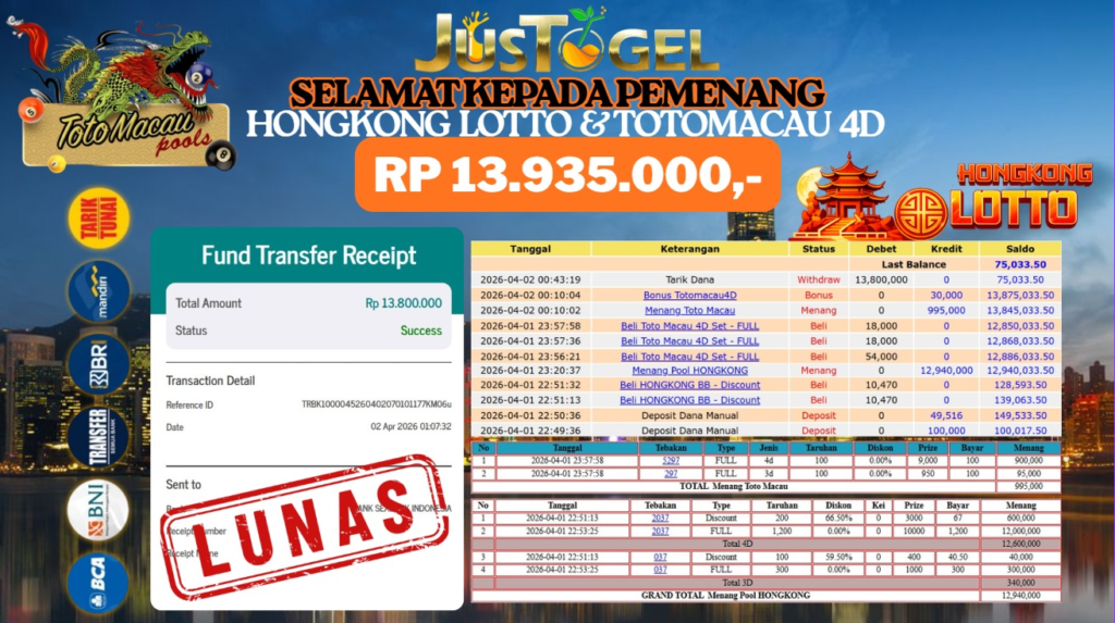 SELAMAT KEPADA MEMBER JP TOGEL HONGKONG LOTTO & TOTO MACAU 4D RP 13.935.000- LUNAS